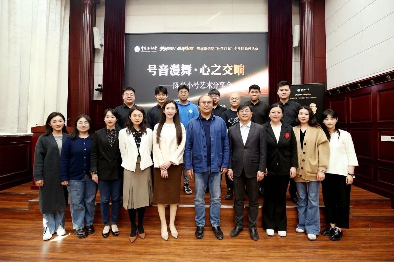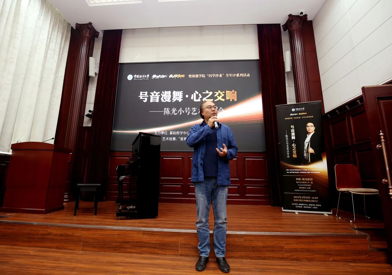 陈光教授面向在场师生介绍了小号的艺术特征,他强调,真正的艺术教育绝非单纯的技术训练,而是借由经典作品传递人类文明的精神内核,并呼吁艺术专业人士肩负起唤醒大众精神世界的责任,秉持对艺术的热爱与情怀,推动美育传播,用情怀守护音乐的人文温度,助力艺术觉醒融入时代发展的进程。
