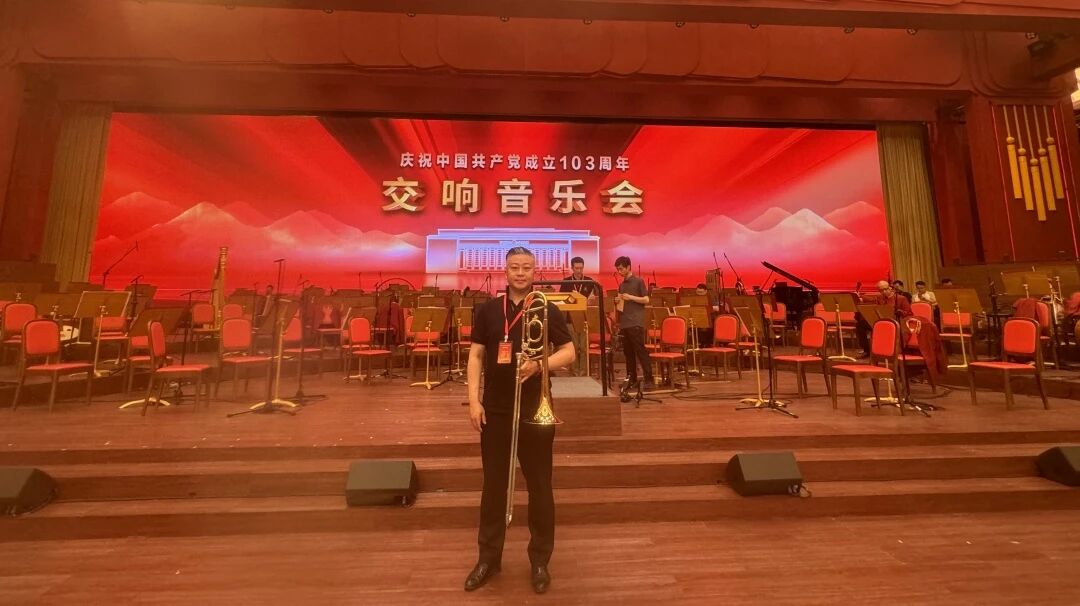 2024年6月30日晚8时,青岛市歌舞剧院交响乐团首席长号黄盟与众多知名艺术家同台献艺,向中国共产党成立103周年献礼。黄盟老师以高度的责任感、精湛的专业技艺和精诚协作的团队精神,高质量圆满完成了此次演出任务。