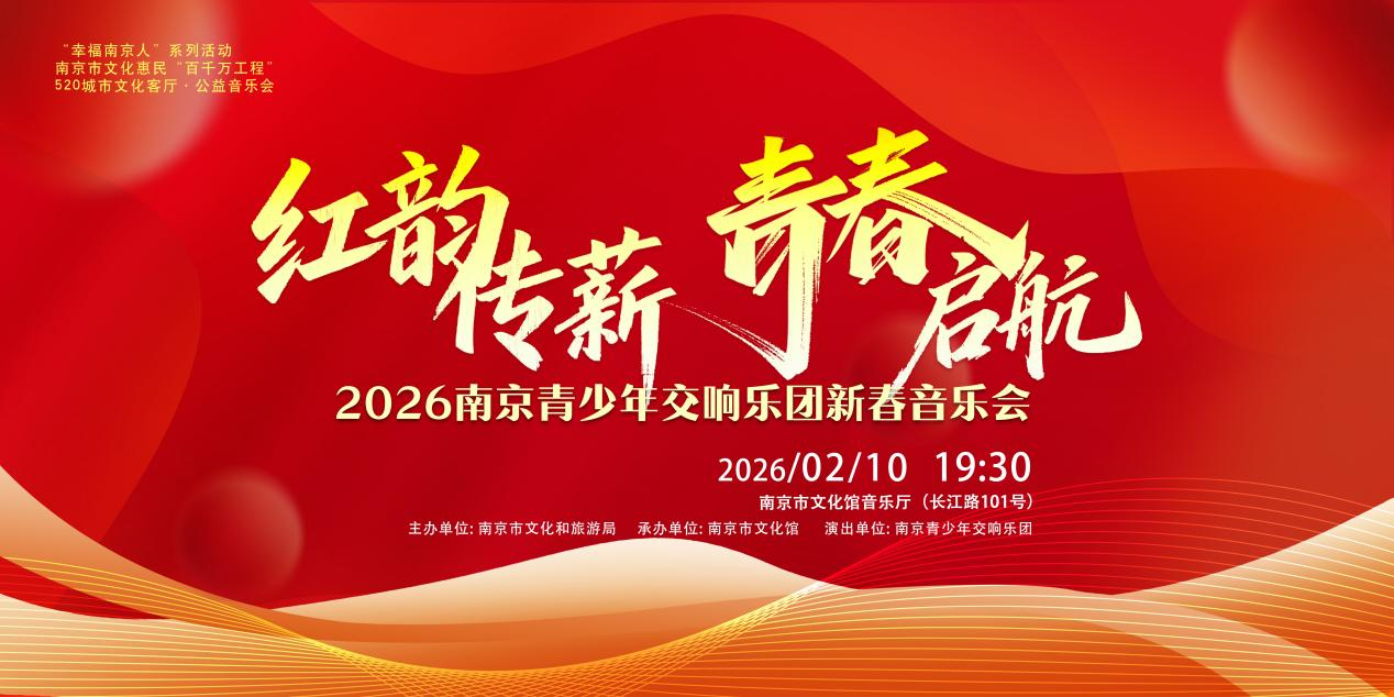 作为“幸福南京人”系列文化活动的重要组成部分,“520城市文化客厅•公益音乐会——‘红韵传薪 青春启航’2026南京青少年交响乐团新年音乐会”将于2026年2月10日19:30通过线上直播方式与广大市民见面。本场音乐会由南京市文化和旅游局主办,南京市文化馆承办,旨在用交响乐的艺术形式传递家国情怀,展现南京青少年的艺术风采与青春活力。