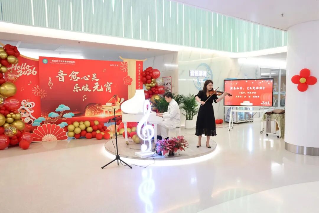 2026年3月3日,丙午马年的元宵佳节,广西医科大学附属肿瘤医院五象院区一楼长廊,被阵阵悠扬的琴声所环绕。一场别开生面的“音愈心灵·乐暖元宵”小型器乐音乐会在这里温情上演,为传统节日注入了独特的疗愈色彩。
