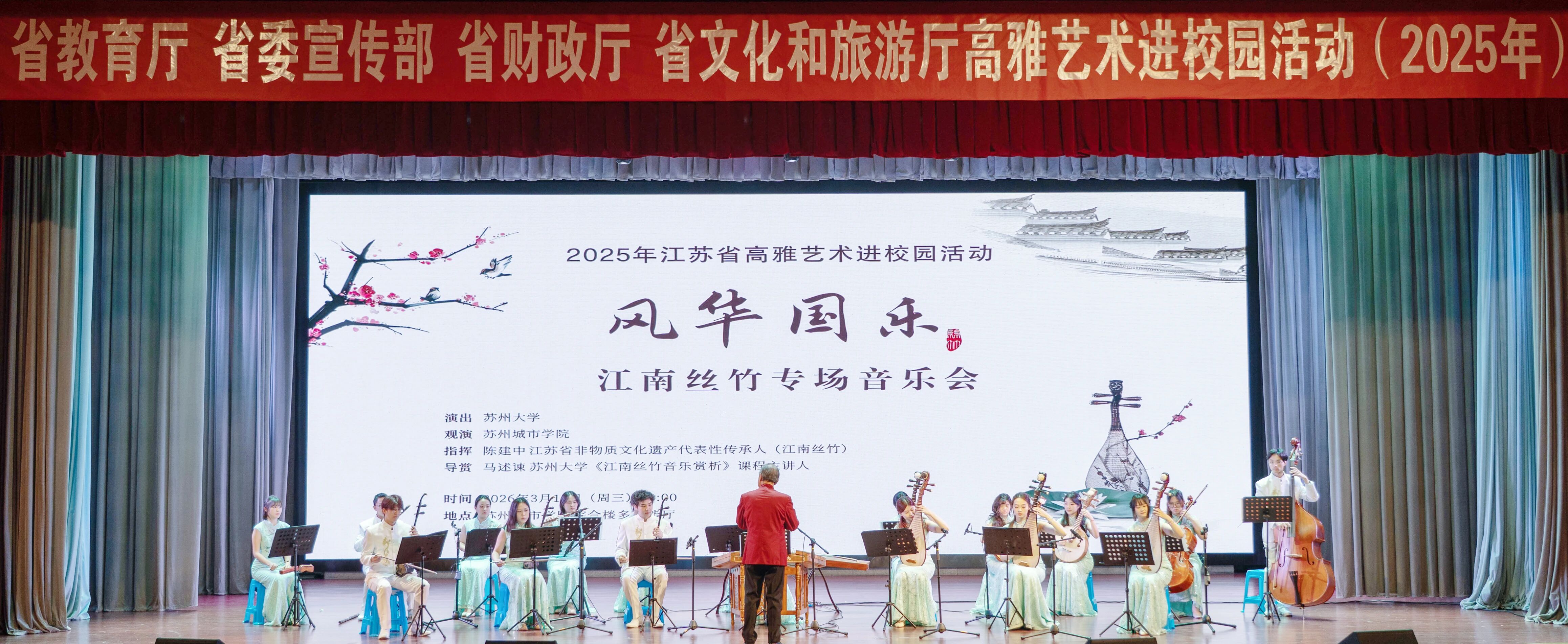 2025年3月11日晚,一场由江苏省教育厅、省委宣传部、省财政厅、省文化和旅游厅联合主办的“高雅艺术进校园”活动在苏州城市学院成功举办。此次活动特邀苏州大学东吴丝竹乐团,为该校师生带来了一场名为《风华国乐》的江南丝竹专场音乐会,为校园文化生活增添了一抹优雅的国风雅韵。