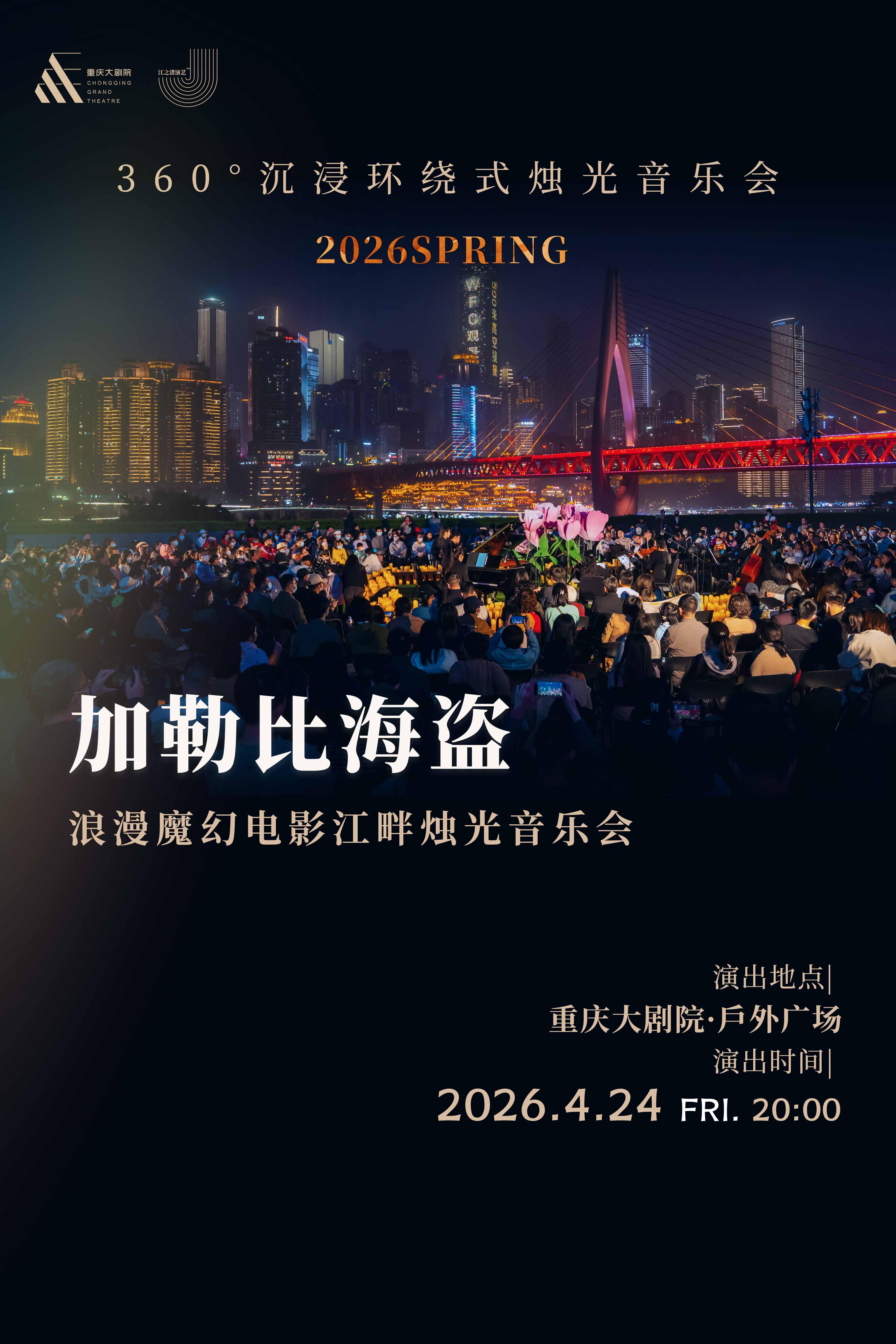 2026年4月24日晚8时,重庆大剧院·户外广场将迎来一场别开生面的音乐盛宴——“360°沉浸环绕式烛光音乐会·2026SPRING《加勒比海盗》浪漫魔幻电影江畔烛光音乐会”。这场由重庆大剧院匠心打造的沉浸式烛光音乐会,将以“烛光+艺术装置+四面视听”的创新形式,为山城观众开启一场从加勒比海到星际宇宙的魔幻电影音乐之旅。