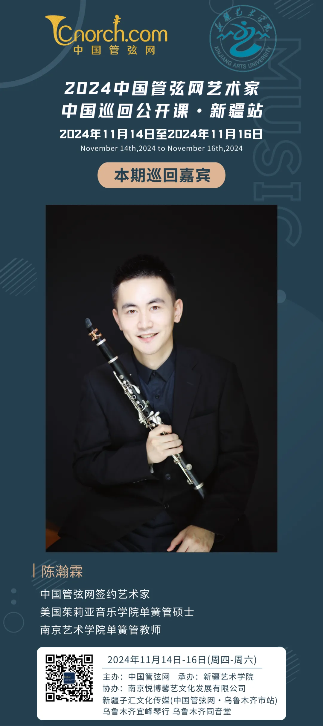2024年11月14日至2024年11月16日,中国管弦网艺术家中国巡回公开课将在新疆首次举办。本次活动由中国管弦网主办,新疆艺术学院承办,南京悦博馨艺文化发展有限公司、新疆雲杉交响管乐团(中国管弦网新疆站)、新疆子汇文化传媒(中国管弦网乌鲁木齐市站)、乌鲁木齐宜峰琴行、乌鲁木齐同音堂协办,特邀美国茱莉亚音乐学院单簧管硕士、南京艺术学院单簧管教师陈瀚霖进行授课、演出,为当地的音乐爱好者、音乐教育工作者分享自己的专业知识及实践经验。