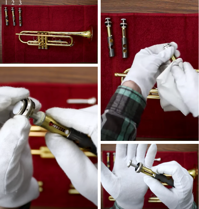 6.如果有通条/软刷,将穿过所有部件:活塞,活塞管、调音管...拿起每个部件并将其放回时要非常小心,不要碰撞其他部分。