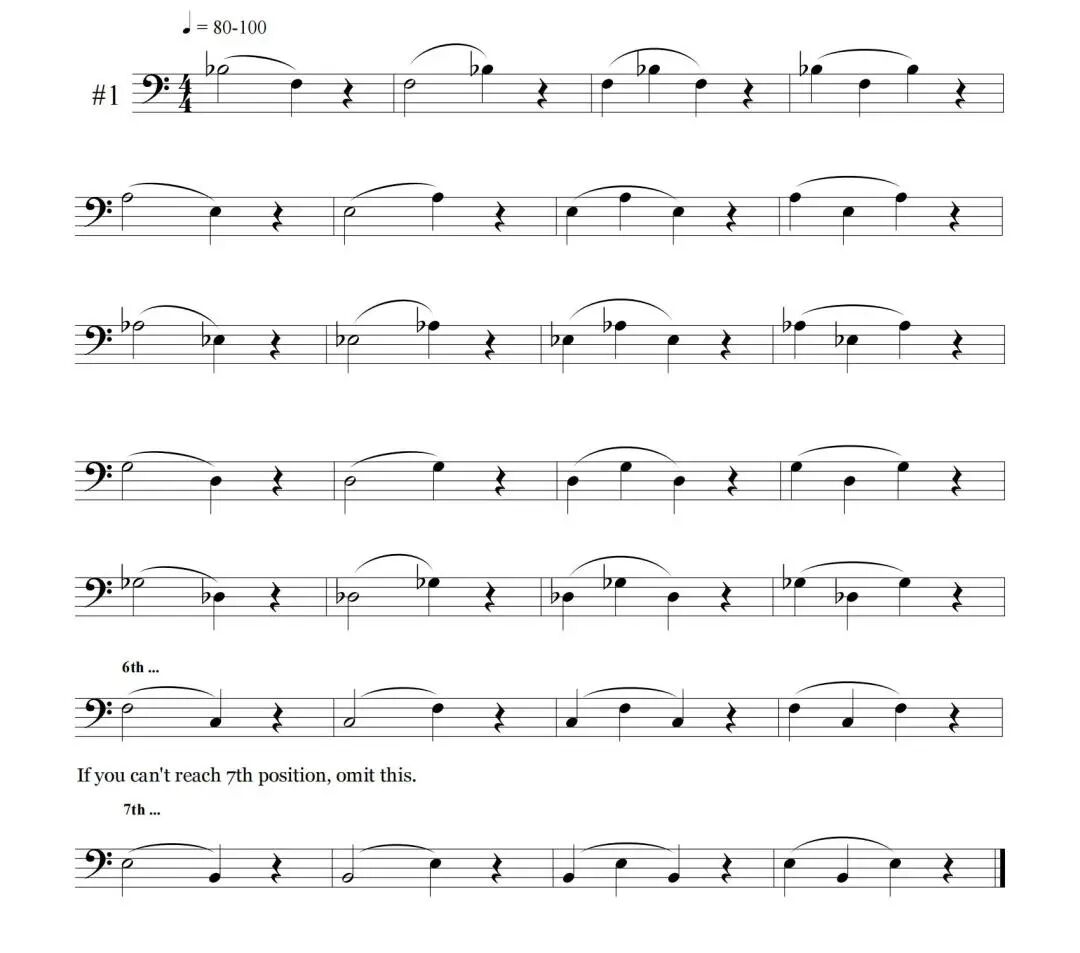 连音很重要!它们可以帮助控制口型。用稳定的气流顺畅地从一个音符到另一个音符。位置的变化应该在号嘴的边缘内。