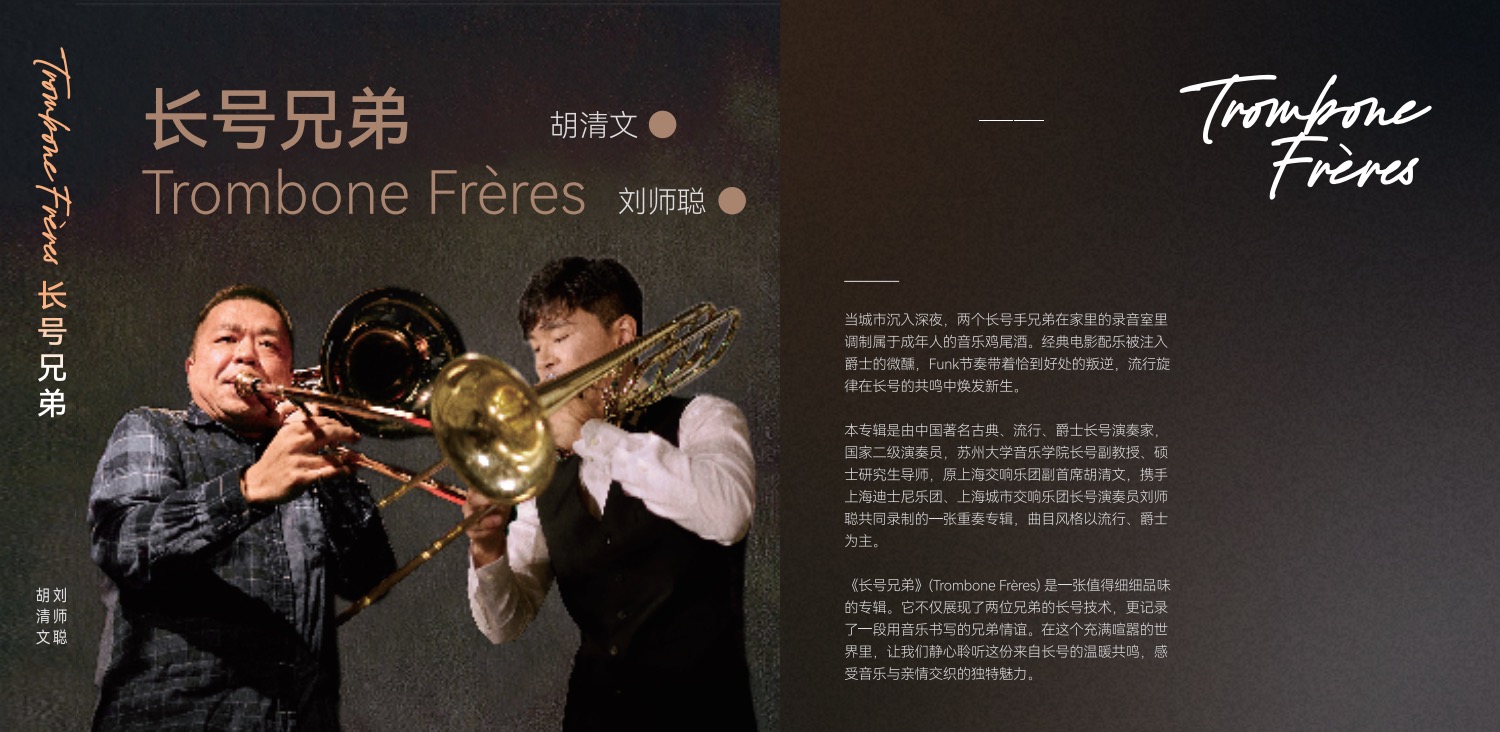 《长号兄弟》是由苏州大学音乐学院副教授、硕士研究生导师,原上海交响乐团副首席胡清文,携手上海迪士尼乐团、上海城市交响乐团长号演奏员刘师聪共同录制的一张重奏专辑,曲目风格以流行、爵士为主,发行于2025年。
