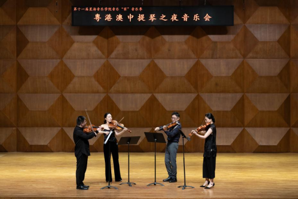 2025年11月26日19:30,星海音乐学院音乐厅·郎朗音乐厅华灯璀璨,“粤港澳中提琴之夜”音乐会在万众期待中拉开帷幕。 下半场开场,董祎老师与其他老师一起演奏《Passacaglia》,以庄重而宏大的气势震撼登场。
