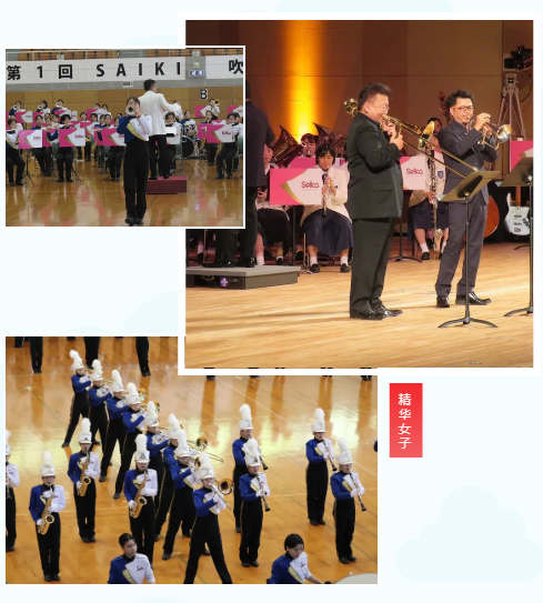 精华女子高等学校吹奏乐部实力强劲,是全日本吹奏乐大赛的常客,多次获得金奖、银奖等奖项。在2005年到2014年期间,更是连续10年独占鳌头,一时风头无两。(2006年和2010年因为“三出”的原因未参赛。三出:连续三年参加全日本吹奏乐大赛的学校,第四年不得参加。)