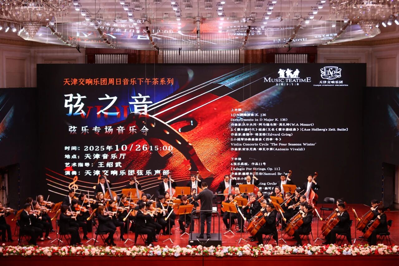 2025年10月26日,天津音乐厅内琴声悠扬,天津交响乐团“周日音乐下午茶”推出“弦之音”弦乐专场演出。音乐会特邀天津音乐学院副院长、中央音乐学院中提琴教授王绍武担任艺术指导并领衔演出,与天津交响乐团弦乐声部的艺术家们联袂登台,为观众带来了一场精致而优雅的弦乐盛宴。