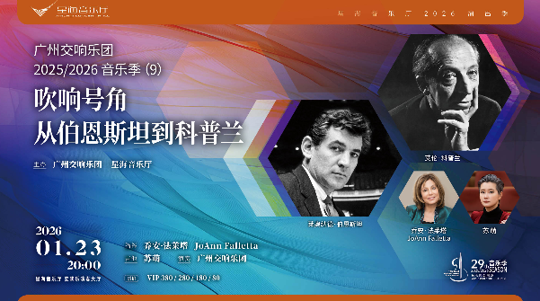 2026年1月23日晚8点,广州交响乐团2025/2026音乐季的第九套乐季音乐会——“吹响号角·从伯恩斯坦到科普兰”将在星海音乐厅交响乐演奏大厅隆重上演。届时,美国指挥家乔安·法莱塔将执棒广交,并与杰出的古典吉他演奏家苏萌同台,共同呈现一场聚焦美国精神的音乐盛会。