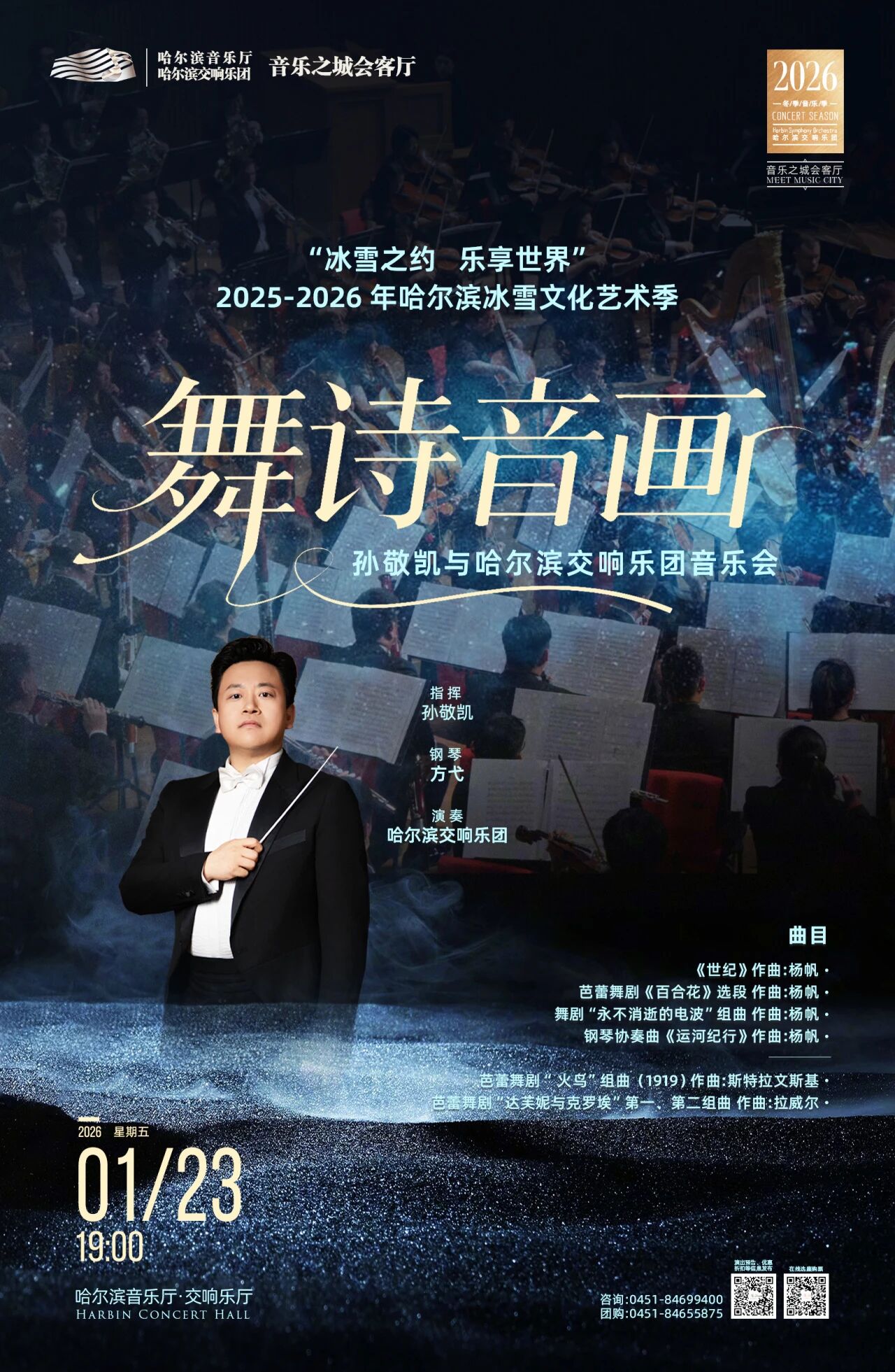 2026年1月23日晚7时,一场名为“舞诗音画”的音乐会将在哈尔滨音乐厅·交响乐厅隆重上演。届时,旅欧指挥家孙敬凯将执棒百年名团——哈尔滨交响乐团,携手哈尔滨本土著名钢琴家、哈尔滨音乐学院教授方弋,为冰城乐迷献上一场融汇中外芭蕾舞剧精华与交响诗画的视听盛宴。本次音乐会因其强大的艺术家阵容与精心编排的曲目,已成为本地新年伊始最受期待的文化活动之一。