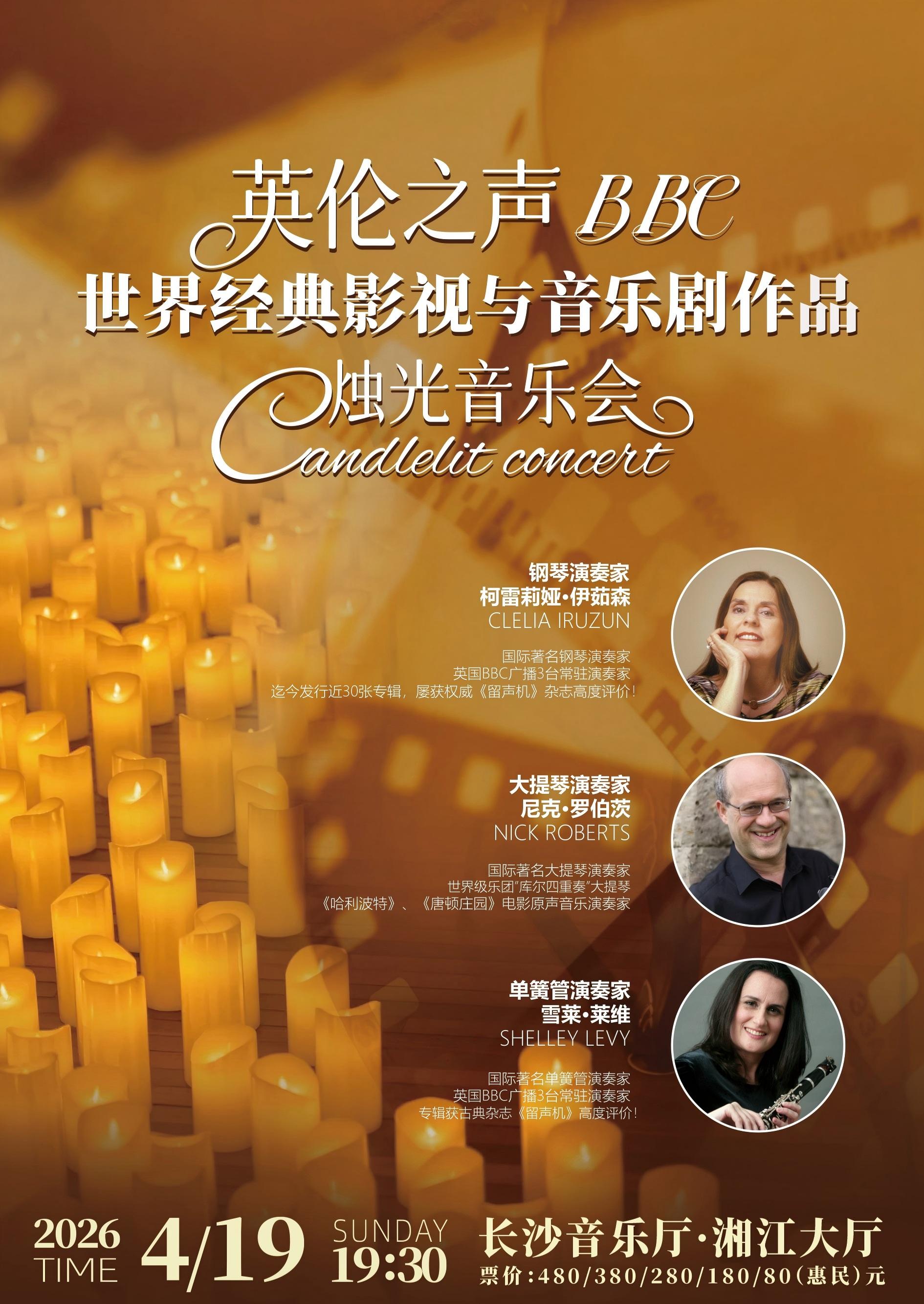 2026年4月19日晚7时30分,长沙音乐厅·湘江大厅将迎来一场视听双重享受的音乐盛宴——“英伦之声BBC·世界经典影视与音乐剧作品烛光音乐会”。三位来自英国的国际艺术家——大提琴家尼克·罗伯茨、钢琴家柯雷莉娅·伊茹森、单簧管演奏家雪莱·莱维——将以烛光为幕,以经典为媒,带领星城观众穿越百老汇、奥斯卡与英伦庄园的光影世界。