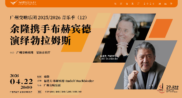 2026年4月22日晚8时,星海音乐厅交响乐演奏大厅将迎来广州交响乐团2025/2026音乐季第十二场乐季音乐会——“余隆携手布赫宾德演绎勃拉姆斯”。广州交响乐团终身荣誉音乐总监余隆将执棒广交,与被誉为“当今最权威的德奥经典演绎者”的钢琴大师鲁道夫·布赫宾德,一晚完整呈现勃拉姆斯仅有的两部钢琴协奏曲。