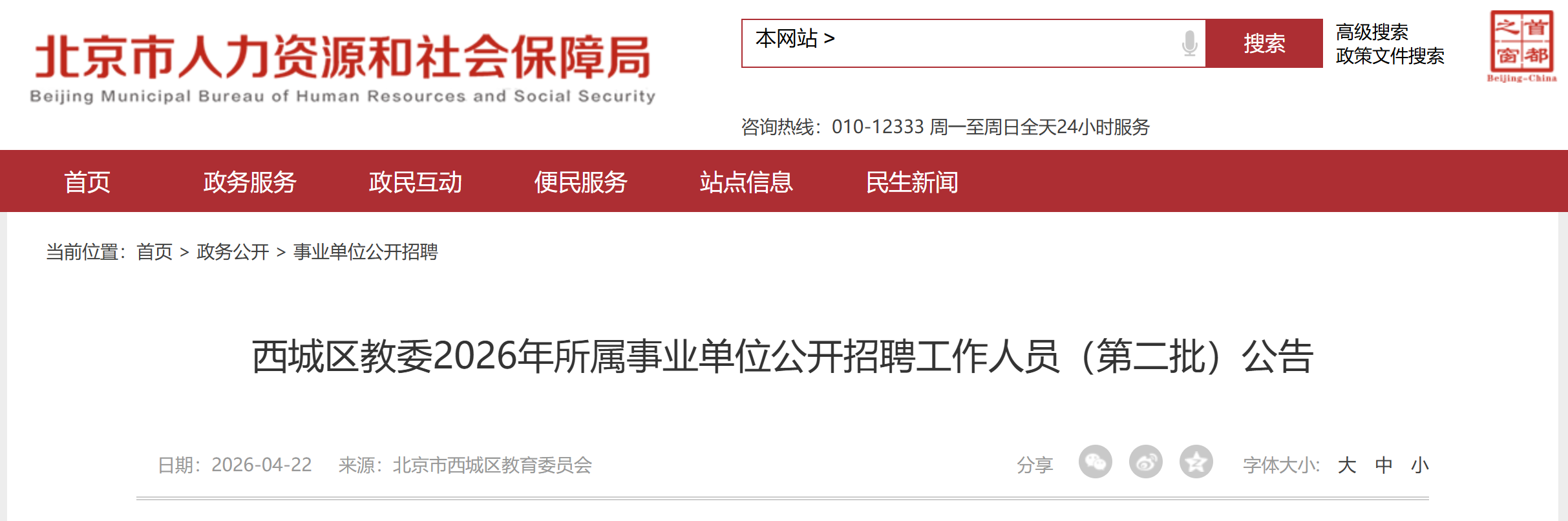 为满足区域教育事业发展需求,北京市西城区教育委员会于近日正式发布2026年所属事业单位公开招聘工作人员(第二批)公告,计划面向社会公开招聘359名在编专业技术岗位工作人员。本次招聘报名通道已于4月24日开启,将持续至4月30日17:00。